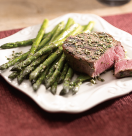Marinade/rub: Combine marinade ingredients in a bowl, setting aside a small portion of mix to be used for asparagus. Rub beef tenderloin with the mixture, then wrap the beef in plastic wrap, refrigerate, and allow to marinate for 30 minutes. While meat is marinating, preheat grill to medium heat and prepare asparagus by washing and trimming ends. Lay asparagus spears on aluminum foil (leave excess aluminum foil at the edges). Sprinkle remaining marinade mix over asparagus spears. Add 1-2 Tbsp water. Fold foil by tucking ends and creating a “tent.” Place on grill, leaving ends folded. Grill beef 15-25 minutes or until desired doneness. Continue to cook asparagus until al dente (tender-crisp).